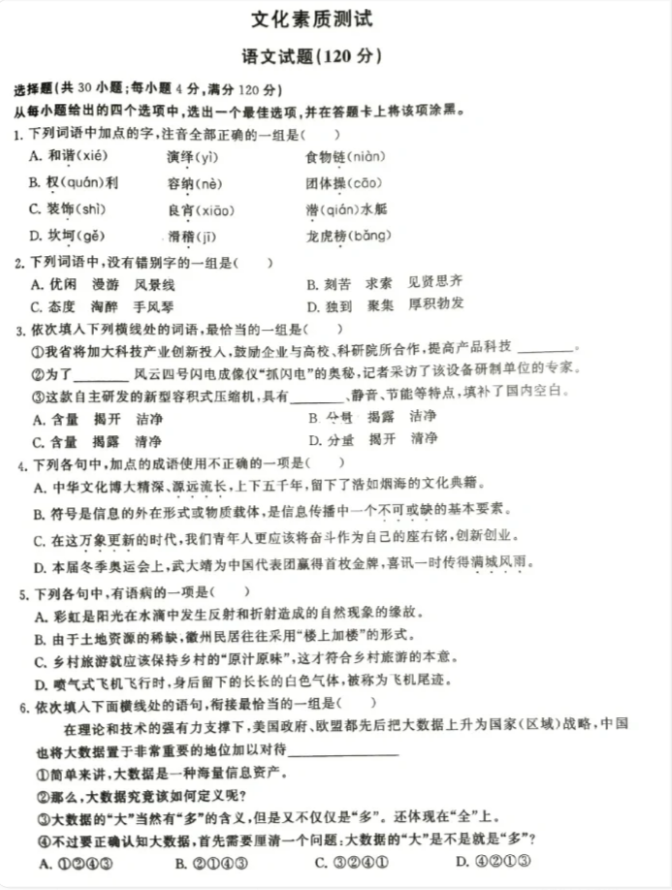 安徽高职分类考试的考试科目分类语文、数学、英语和职业技能考试,今天重点给大家带来语文考试的试卷真题预测。语文考试卷面满分120分,在文化考试中还是很重要的,试卷共30小题,都是单项选择题,接下来一起来看看预测的试卷题目吧。