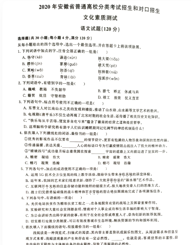 准备备考安徽高职分类考试的同学注意啦,安徽高职分类考试的文化考试一般在每年3月份报考,4月份考试,同学们可以看看这份2020年的语文真题资料哦,希望可以给你们带来帮助。