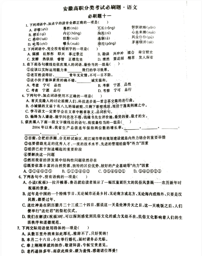 安徽高职分类考试是安徽省针对中职生的一门升学考试,考试的时间一般安排在每年4月初,现在距离安徽高职分类考试还有5个月左右,所以准备复习备考的同学们要注意啦。接下来安徽高职分类考试网为大家分享文化考试中的语文模拟题及答案供大家参考,一起来看看吧。