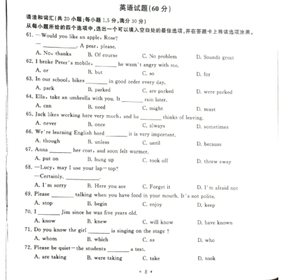 导读:安徽高职分类考试网为大家分享2018年安徽高职分类考试英语试卷真题资料,包含试卷结构和题型的设置,希望能给准备备考的朋友一点帮助。