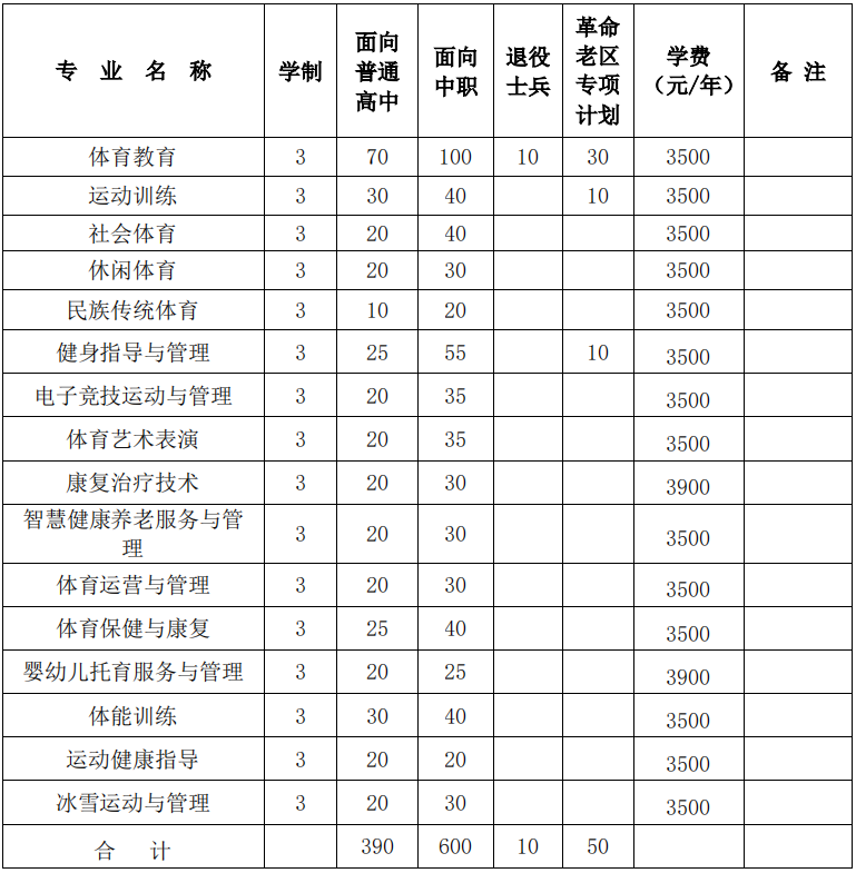 2024年安徽体育运动职业技术学院分类招生共计1050人,其中面向普通高中生招生390人,面向中职生600人,面向退役士兵10人,面向革命老区考生招生50人,详细的招生计划表如下: