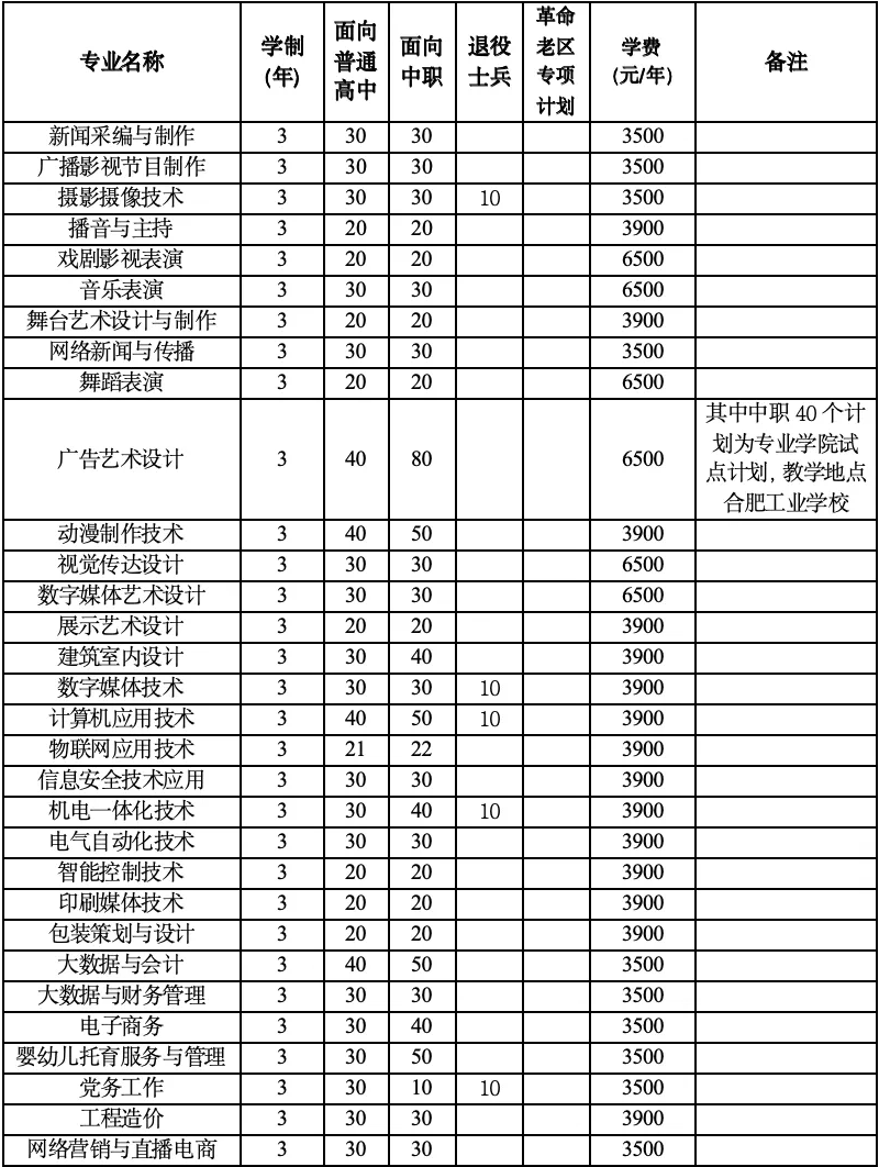 合肥市安徽新闻出版职业技术学院分类考试招生计划