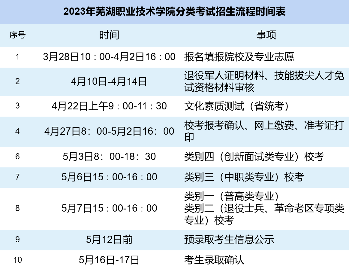 2023年芜湖职业技术学院分类考试招生流程时间一览表