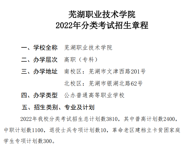 您现在的位置: 安徽高职分类考试网 >  招生院校 > 芜湖职业技术学院 > 招生简章  > 芜湖职业技术学院2022年分类考试招生章程