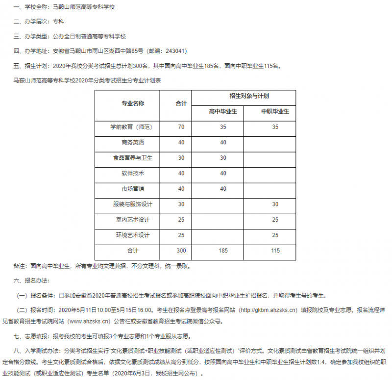 以上就是“马鞍山师范高等专科学校2020年分类考试招生章程”的全部内容,更多关于安徽高职分类考试的相关内容,如安徽高职分类考试报考条件、报名时间、考试科目、安徽高职分类考试成绩查询、分数线等敬请关注安徽高职分类考试网。