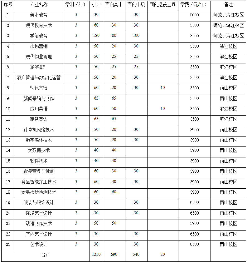 马鞍山师范高等专科学校2024年招生计划已出,2024年马鞍山师范高等专科学校分类考试招生总计划1250名,其中面向普通高中毕业生690名,面向中职毕业生540名,面向退役士兵专项计划20人。以下是详细的招生计划表。